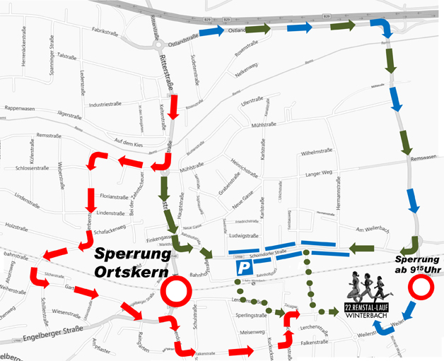 Die im Plan mit roten Pfeilen markierte Route ist die offizielle Anfahrt zum Remstal-Lauf und als solche ausgeschildert. Es ist die einzige Zufahrt, die den ganzen Tag über zu befahren ist und direkt zum Sportgelände führt. Allerdings werden Sie dabei auf recht großem Umweg mitten durch die Winterbacher Wohngebiete umgeleitet.